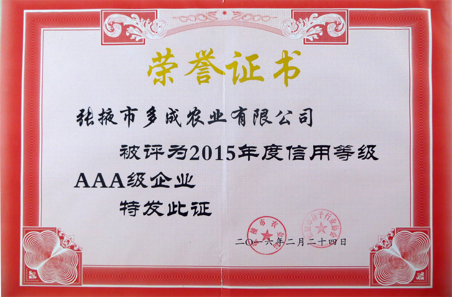 熱烈祝賀張掖市多成農(nóng)業(yè)榮獲2015年度信用等級(jí)AAA企業(yè)稱號(hào) (2016-02-26)